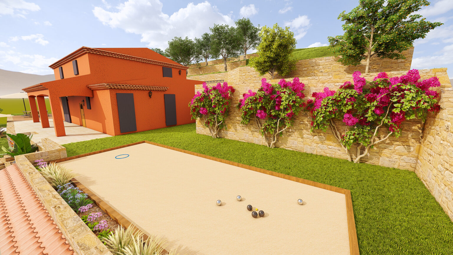 L’espace de loisir intègre un terrain de pétanque borduré de traverses en chêne, mis en valeur par des plantations fleuries et des graminées. Des bougainvilliers habillent le mur voisin, tandis qu’un gazon synthétique limite l’entretien.